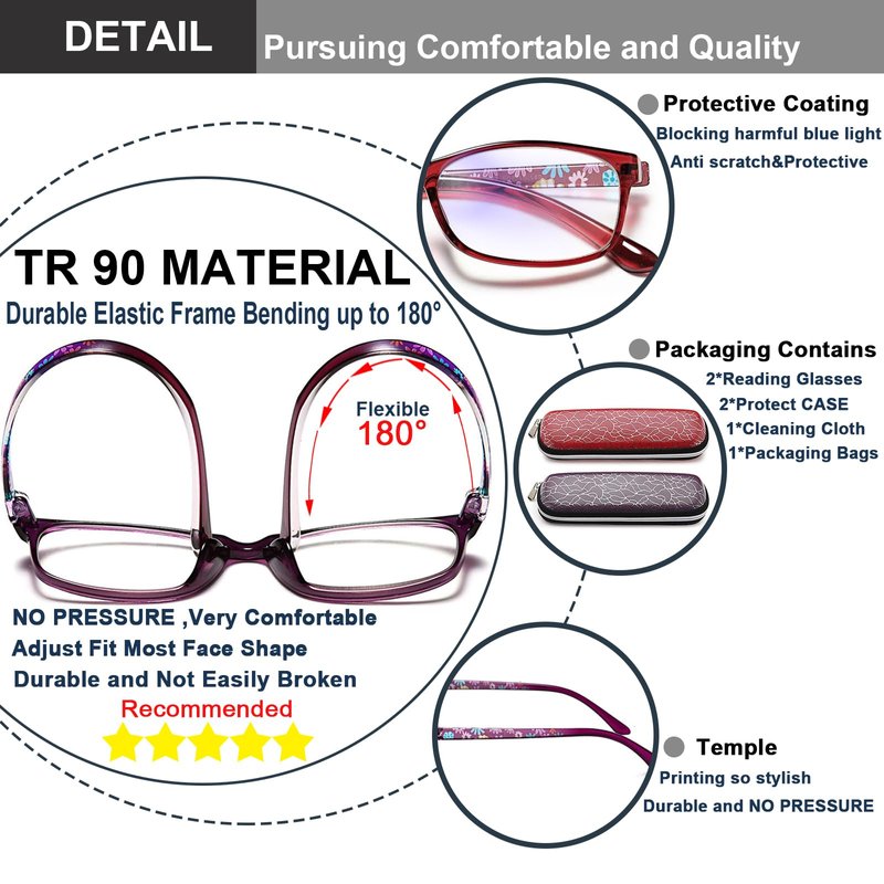 - 【PACKING INCLUDES】2 Pairs women reading glasses + 2 Beautiful glasses case + 1 High-grade glasses cloth.