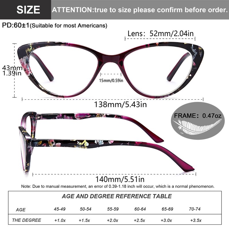 - 【High Quality Spring Hinge】The ladies reading glasses are designed with high quality spring hinges. Cat eye frame, lightweight and comfortable, Does not oppress the head, suitable for most face types.