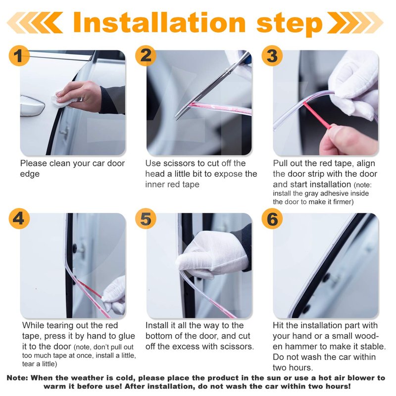 16Ft( 5M) car door edge guards Installation Steps: *Place the door trim under the sun for about 3-5 minutes (This step make the trim more flexible).