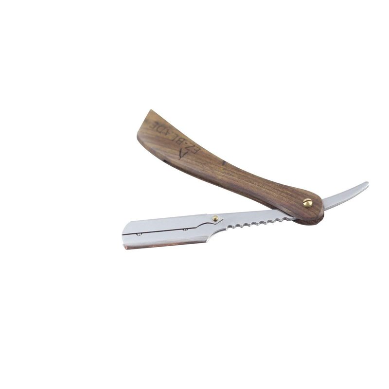 DESCRIPTION Try our premium straight edge razor. The Ez Blade Straight razor handle is made of A1 quality mahogany wood. The blade holder is made of stainless surgical steel and will last a lifetime. Use this butterfly style, straight edge razor for all your shaving needs What kind of razors does it take? Disposable Double edge razors