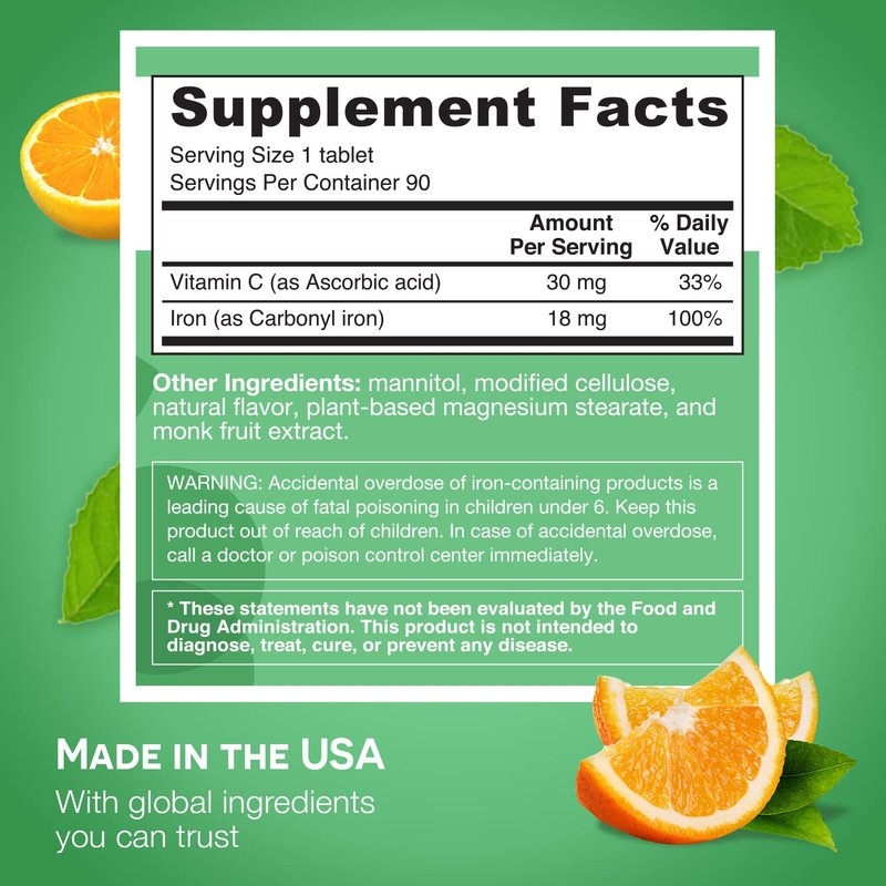 - Sweet Without the Sugar –– Indulge in a refreshing zesty orange flavor taste created by plant-derived ingredients. These iron supplements for men and women are formulated without the use of any artificial flavors or coloring. No sugar, no hidden ingredients, no nonsense