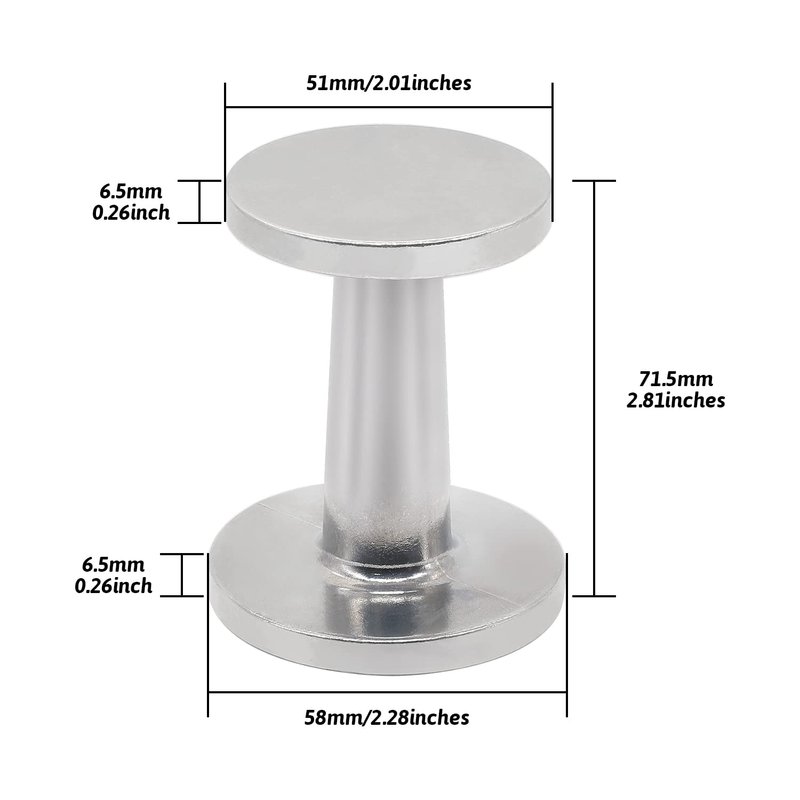 - The dual ends of this tamper(51mm and 58mm) fit most portafilter baskets, evenly distributes, compress and level ground coffee for a denser, richer and more flavorful espresso brew.