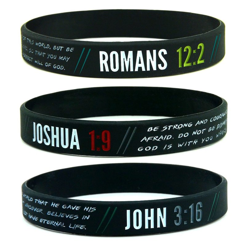 - Pack of 6 silicone wristbands with Bible verses; Includes 2 each of John 3:16, Romans 12:2, and Joshua 1:9