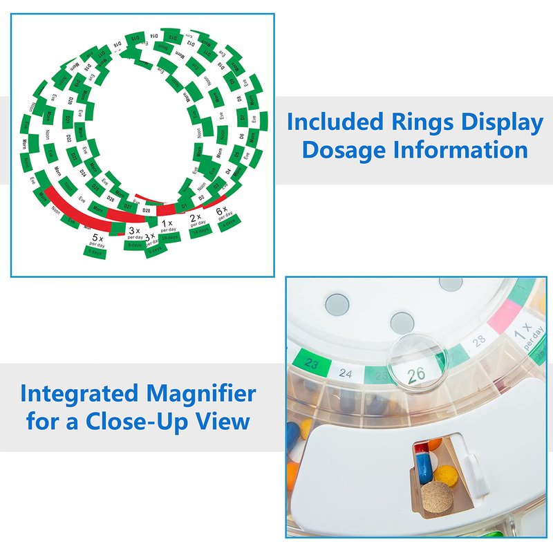 - 6 INTERCHANGEABLE DOSAGE RINGS | 6 Different Dosage Rings Helps You Customize The Dispenser According To Your Daily Medication Or Vitamin Regimen & Improve Accuracy & Prevent Missed or Accidental Double Doses | High-Capacity Slots Fit Up to 24 Aspirin-sized Tablets Each for Minimal Refills & Maximum Efficiency