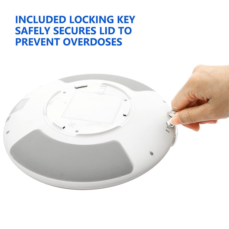 - KEY & EXTENDED SAFETY FEATURES | Locking Cover Blocks Unauthorized Access, While Integrated Magnifier Gives Close-Up View of Dosage Info; Wireless Battery-Operated Device is Perfect for Home or Travel | Contains: Automatic Pill Dispenser, 1 Medication Tray, 6 Dosage Rings, 1 Metal Key, Easy Set-up Manual and 4 AA Batteries.