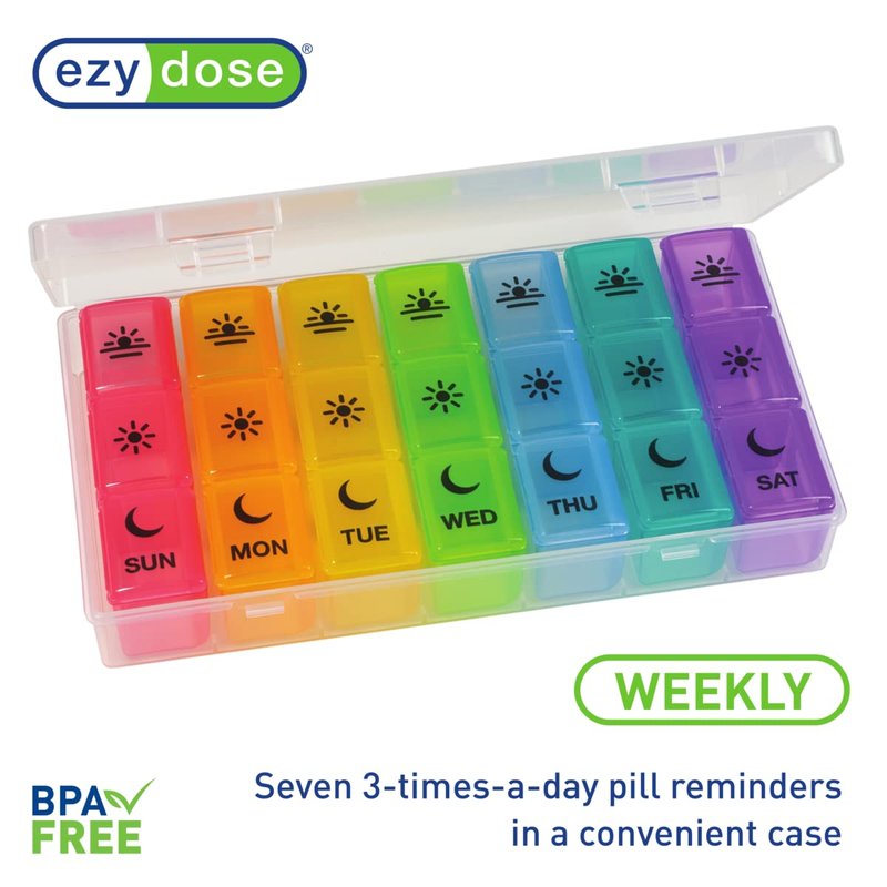 Ezy Dose Weekly (7-Day) Pill Case, Medicine Planner, Vitamin Organizer Box, Convenient and Easy to Use, X-Large Pop-Out Compartments, 3 Times a Day, Rainbow Lids with Case, BPA Free