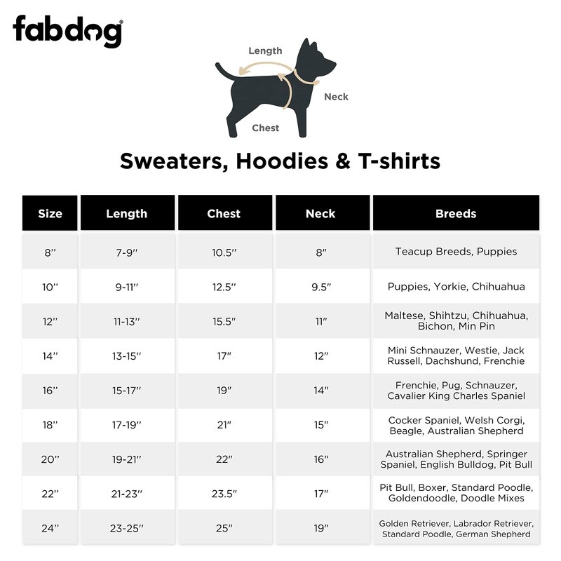 - VARIETY OF SIZES: Whether you have a small pup or a large pet, give him the comfort he craves with a Fabdog sweater. Our pet sweaters for puppies and large dogs are available in sizes that range from 8-inch to 24-inch.