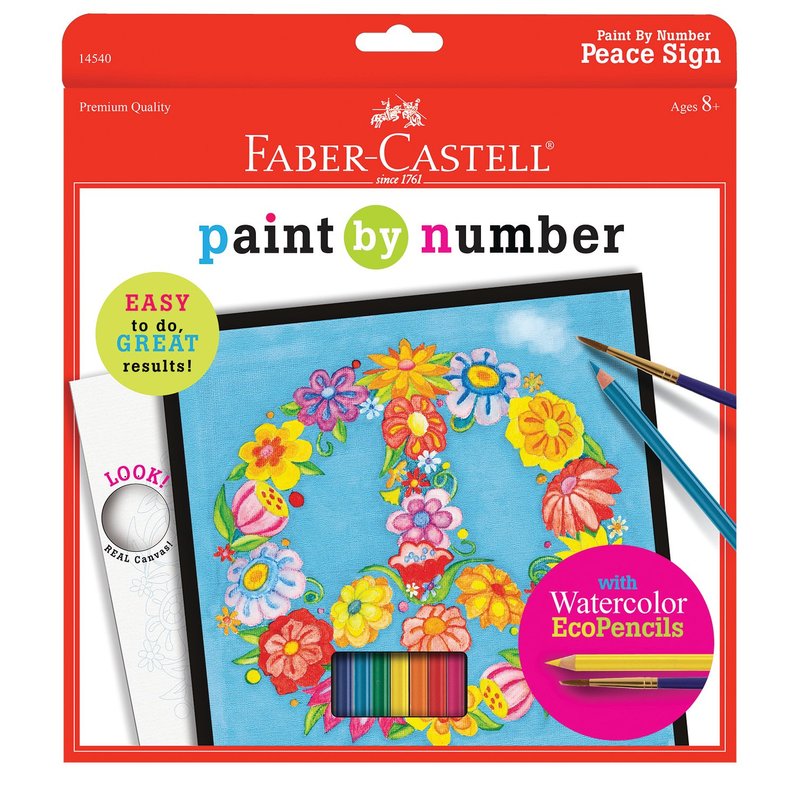 - COMPLETE KIT: Comes with everything you need to complete the paint by number. Kit includes 7 Faber-Castell quality Watercolor EcoPencils, real artist canvas, numbered color guide, paint brush, display and mounting materials to hang your finished projectCOMPLETE KIT: Comes with everything you need to complete the paint by number. Kit includes 7 Faber-Castell quality Watercolor EcoPencils, real artist canvas, numbered color guide, paint brush, display and mounting materials to hang your finished peace sign