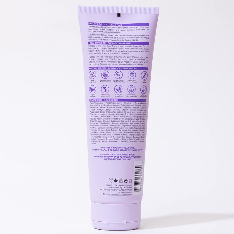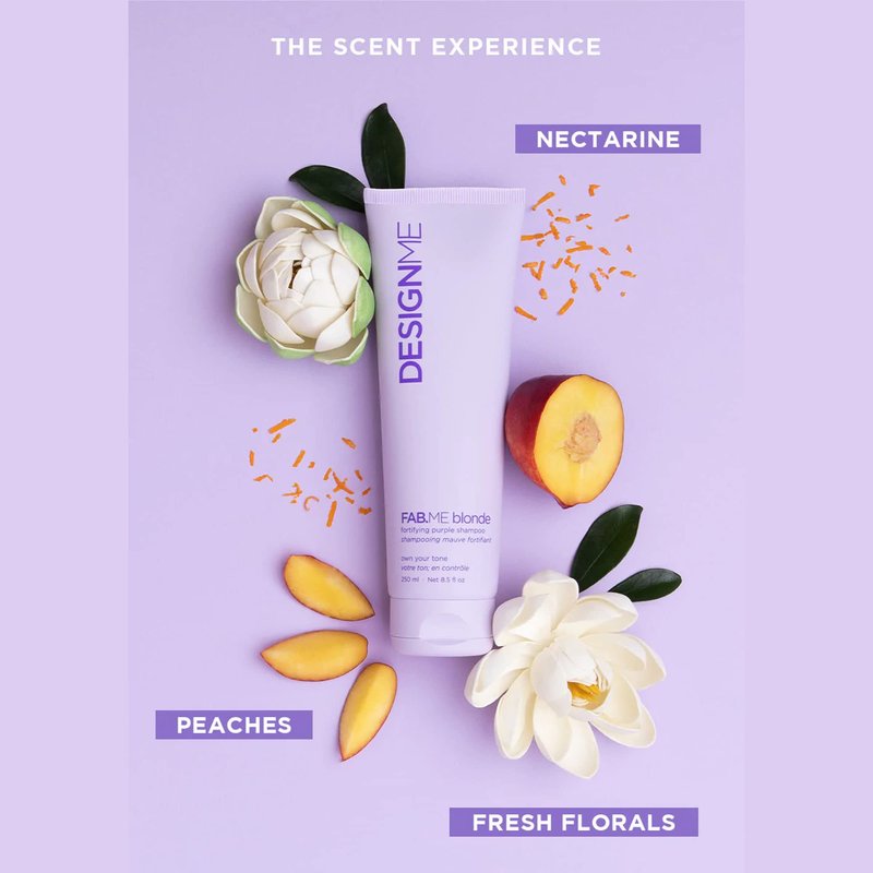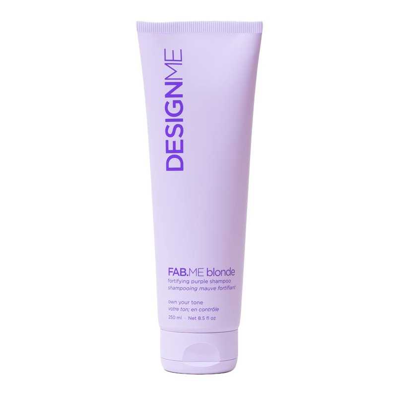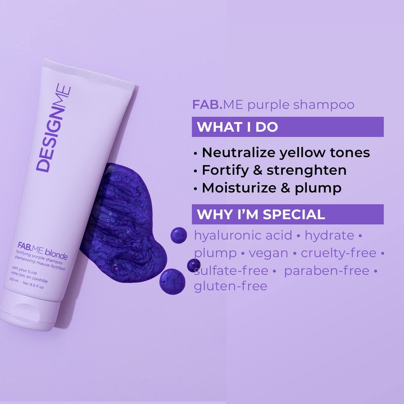 FAB.ME Blonde Fortifying Purple Shampoo noticeably brightens blonde, white, and gray hair tones—both natural and color-treated. Sulfate-free, paraben-free formula features nourishing natural ingredients like ginger root, bamboo root extract, and quinoa and a luscious floral-fruity scent.
