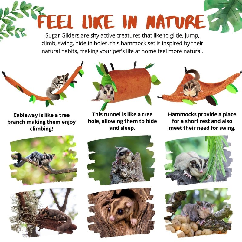 - 【Feel Like Living in Nature】This small pet hammock set is inspired by the sugar glider's natural habitat. Sugar gliders are forest-dwelling, active animals. They like to swing, climb, glide, and jump. This set's four hammocks with different functions with bright color making sugar gliders or other small pets feel like they're living in the nature. (Please make sure you get the real product from our Fab-mode store before place order in case to get the wrong items.)