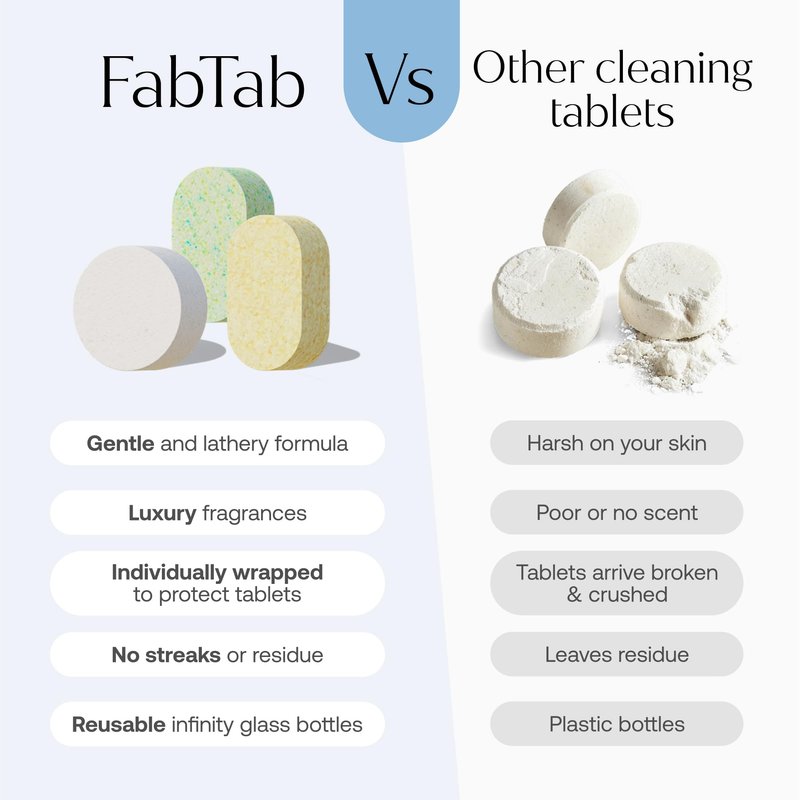 Give dirt a one-two punch with our home cleaning and hand washing tablets. Crafted from gentle ingredients, the FabTab cleaning tablets obliterate the need for harsh chemicals. By welcoming FabTab into your cleaning routine, you're not just tidying up – you're joining a tribe of eco-conscious warriors and championing a better world where pristine spaces and responsinle choices unite seamlessly. Our FabTab cleaning tablets provide you with a quick and affordable solution for all your cleaning needs. We designed these plastic free cleaning tablets to dissolve in water to create a cleaning solution in a matter of minutes. Drop one of our spectacular foaming hand soap tablets into your glass bottle already filled with warm water, watch it dissolve entirely, and voilà – your hands are in for a dance party