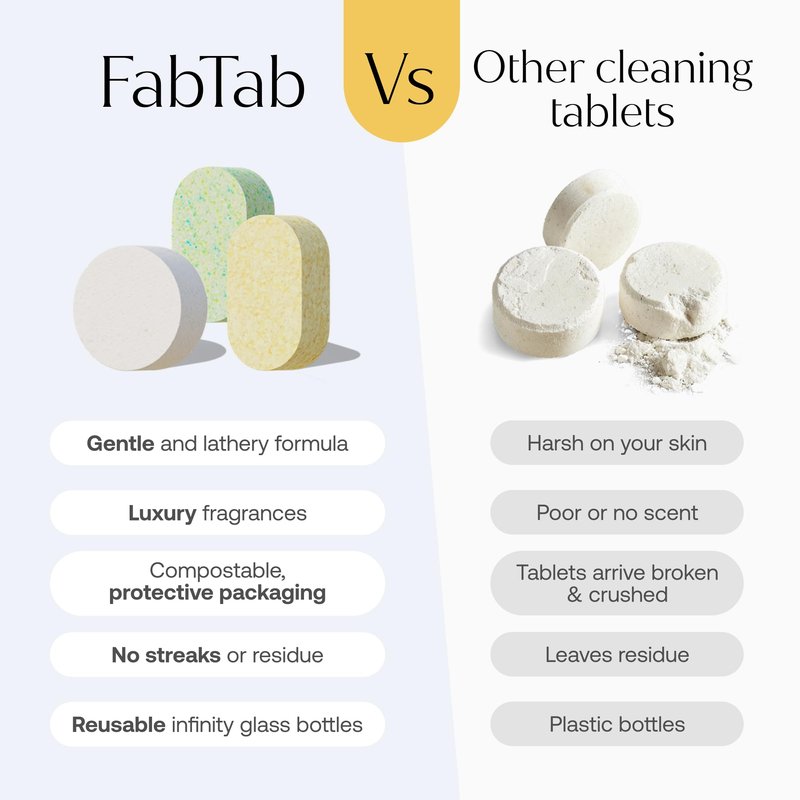 Embrace a new era of home cleaning with FabTab's foaming hand soap tablets, a sustainable and convenient solution for a sparkling clean home. Our foaming hand soap dispenser kit provides everything you need to transform your hand washing routine. Simply pop a hand soap tablet into the glass foaming hand soap dispenser, add water, and watch as it fizzes into a luxurious foam hand soap. Our hand soap tablets are not only good for the planet but also gentle on your skin. Crafted with plant-based ingredients, our hand soap foam tablets are free from harsh chemicals, making them safe for the whole family, even hand soap foaming for kids. Ditch the plastic and embrace sustainability with our refill hand soap foaming tablets, a small change that makes a big difference. Experience the joy of guilt-free cleaning with FabTab's DIY handwash, where effectiveness meets environmental responsibility. Choose FabTab and make every wash a step towards a healthier planet. Our bathroom hand soaps are available in a variety of delightful scents, transforming your daily routine into a fragrant escape. Experience the difference with FabTab, where cleaners for home are designed with both your family and the earth in mind.