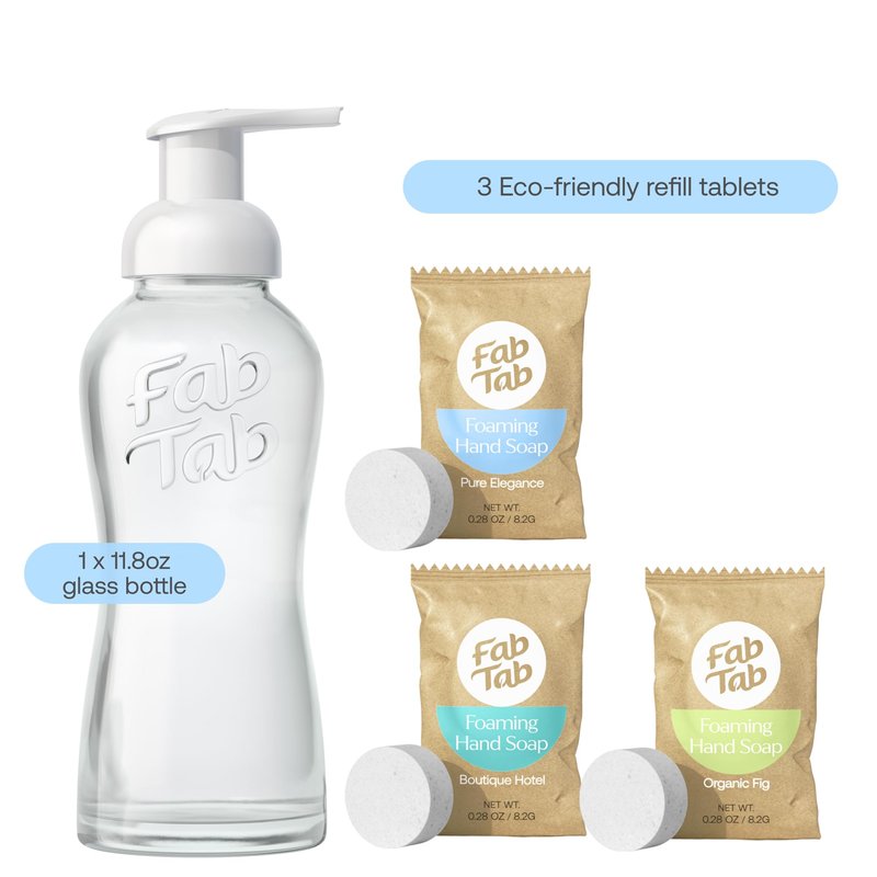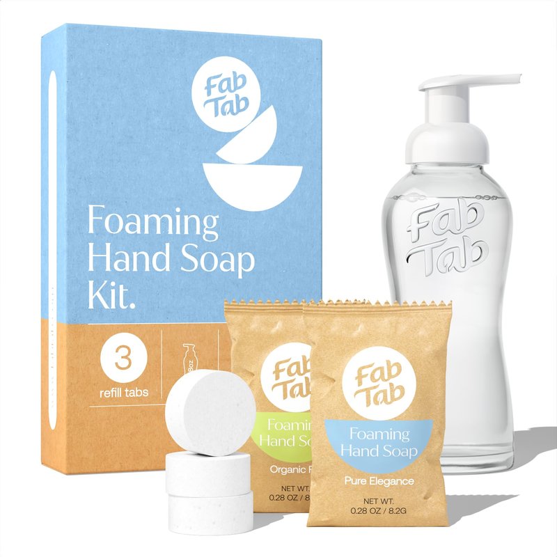 - Experience clean hands with our foaming hand soap kit, a perfect addition to any bathroom. This foaming hand soap kit includes 3x refill tabs and a glass bottle.