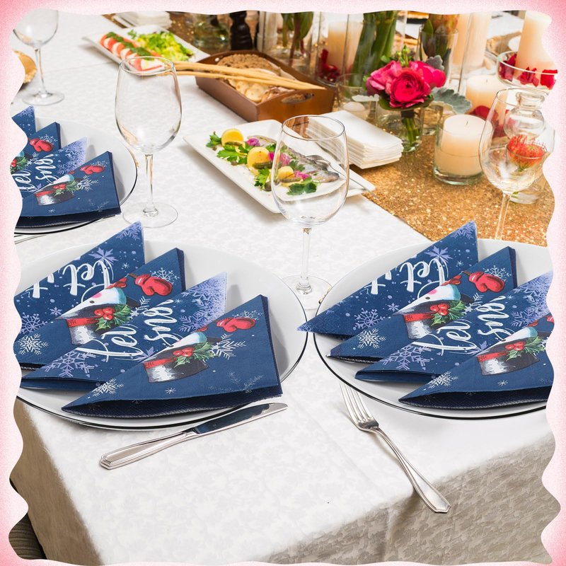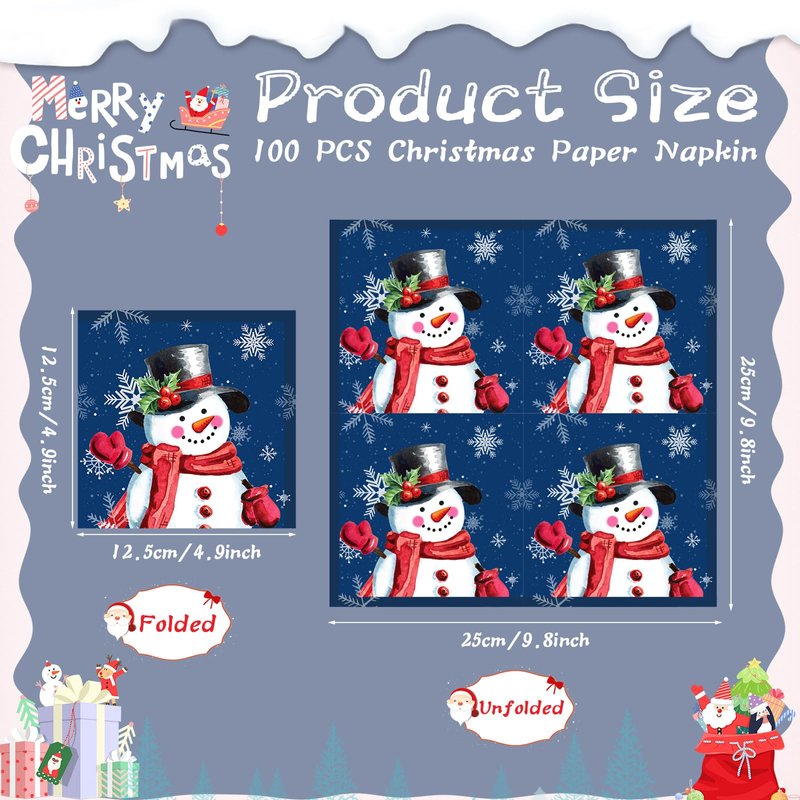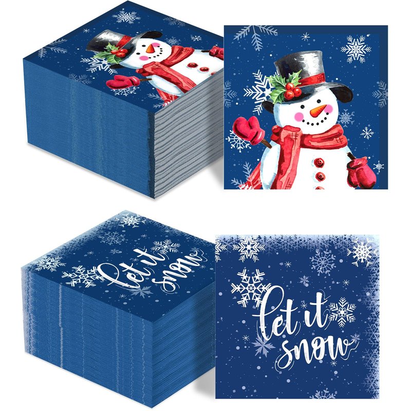- Elegant Design: the Christmas cocktail napkins are designed with 2 different styles, one features a cute snowman wearing a top hat decorated with red berries and a scarf is smiling and waving to you; The other one is patterned with festive text [Let It Snow], which are paired with many beautiful snowflakes, which will make any lunch, dinner, dessert, brunch, drink, buffet bar look fancy