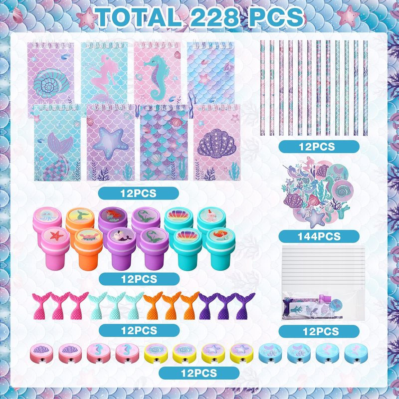 - Rich 172 Favor Sets: you will get total 172 mermaid party favors, including 24 mermaid notebooks, 4 mermaid round stickers, 24 mermaid irregular shape stickers, 24 mermaid pencils, 24 mermaid stampers, 24 mermaid erasers, 24 mermaid pencil sharpeners, 24 mermaid party goodie bags