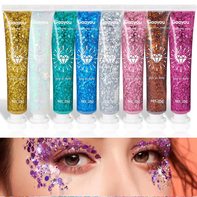 Face and Body Glitter 8PCS Body Glitter Face Glitter Gel, Singer Concerts Festival Rave Accessorie, Glitter Face Paint Holographic Chunky Glitter for Makeup
