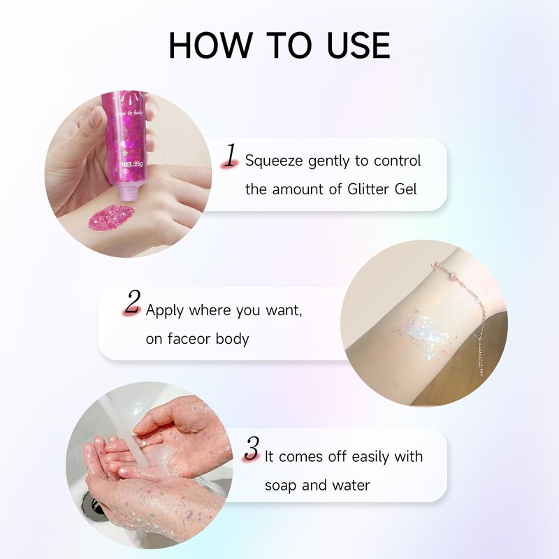 - 【Sparking and Gorgeous】: Our body glitter gel includes small stars, moons, and hexagonal glitters. It also features a variety of holographic glitters that creating a stunning multidimensional effect with shifting shades and vibrant shine. It also has a pleasant scent that makes you more attractive at parties.