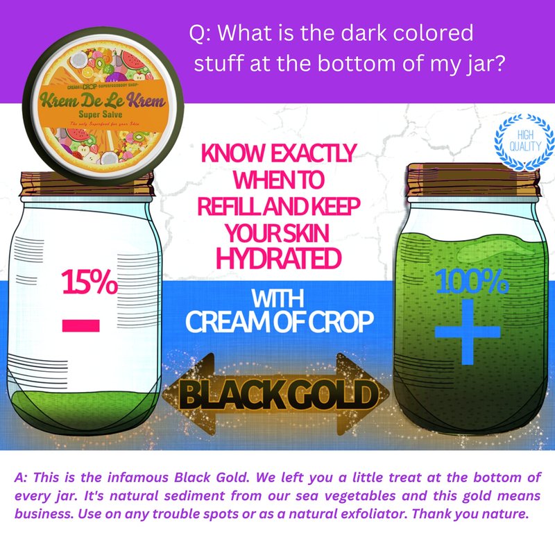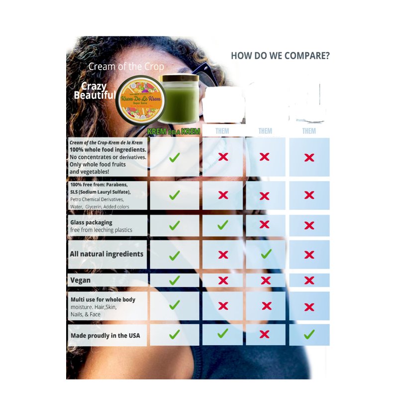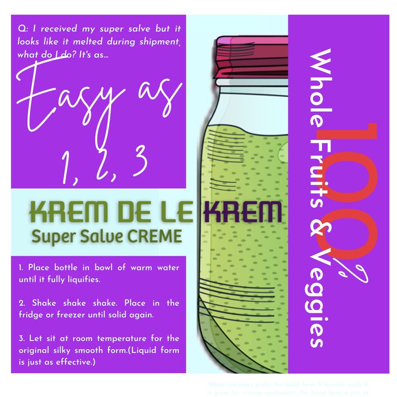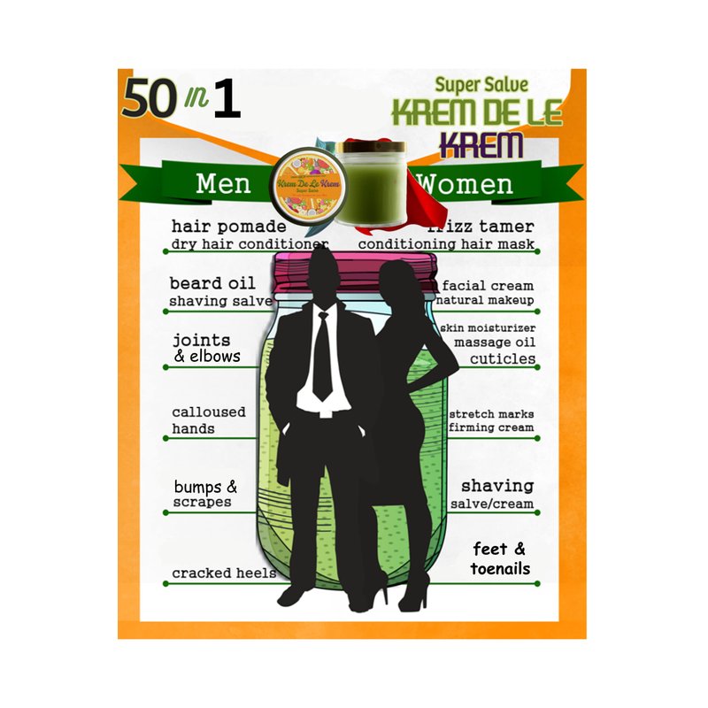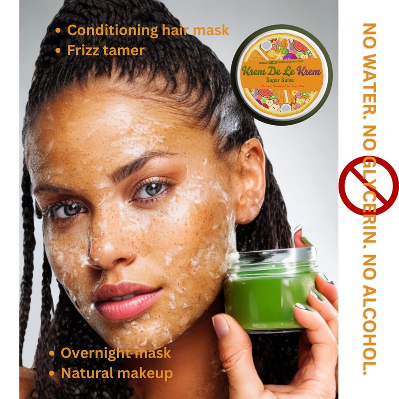 Tired of Chemical-laden Moisturizers That Leave You Feeling Greasy? Look No Further Than Our All-Natural Silky Smooth Super Salve🦸♂️Krem de le Krem! Made With 100% Fruits & Vegetables & 🚫No Water, Glycerin or Alcohol. Not Only Can It be Used As a Face Moisturizer, But Also As a Body Lotion, Ultra-Repair Serum, Overnight Mask, Eye Cream, & More! With Over 50 Different Uses This Multi-Tasking Miracle Balm is Handmade With Only the Finest Superfoods Like Moringa Leaf, 🍇 Grape Seed Oil, And Camu Camu Berries for Radiance & Glowing Skin. We Even Use Fair Trade Red Palm Fruit Oil, Which Has One of The Highest Natural Sources of Vitamin A & E on Earth🤯 Talk about supple and dewy skincare. Plus It's Easy to Use & Versatile Enough for the Entire Family. That's right - it's for Men, Women & Kids. If You've Got Skin, You're In! Less is More With Superfoods, So Only Start With a Pea Size Amount (it's more spreadable than butter) & Experiment to Cover All Your Skin Care Needs (Rub in for 30 seconds or until fully absorbed) So Why Not Try Our Small Batch, Handmade Moisturizer Today and Take Your Beauty Routine to the Next Level?↗️ USES: Frizz Tamer, Conditioning Hair Mask, Eye cream, Facial cream, Natural Makeup, Overnight Mask, Lip Balm, Massage oil, Cuticles, Stretch marks, Firming cream/bum, Shave cream, Tattoos, Muscles, Hair pomade, Dry hair conditioner, Face moisturizer, Beard oil, Hands, Wrists, Knees, Elbows, Workout, Feet/Heels *Glass jars change seasonally (round, hexagon,oval) *Since this is a natural product, color may vary slightly (green) & natural settling may occur.