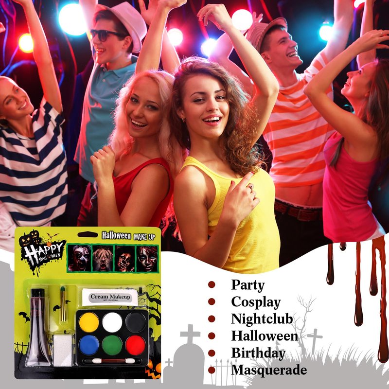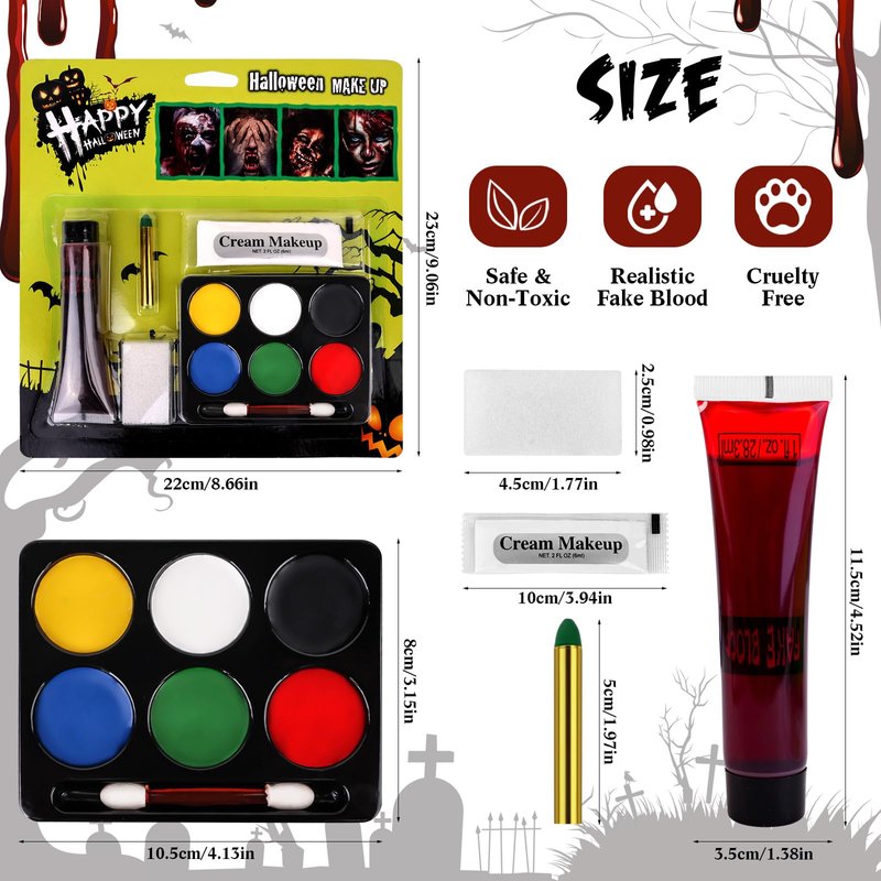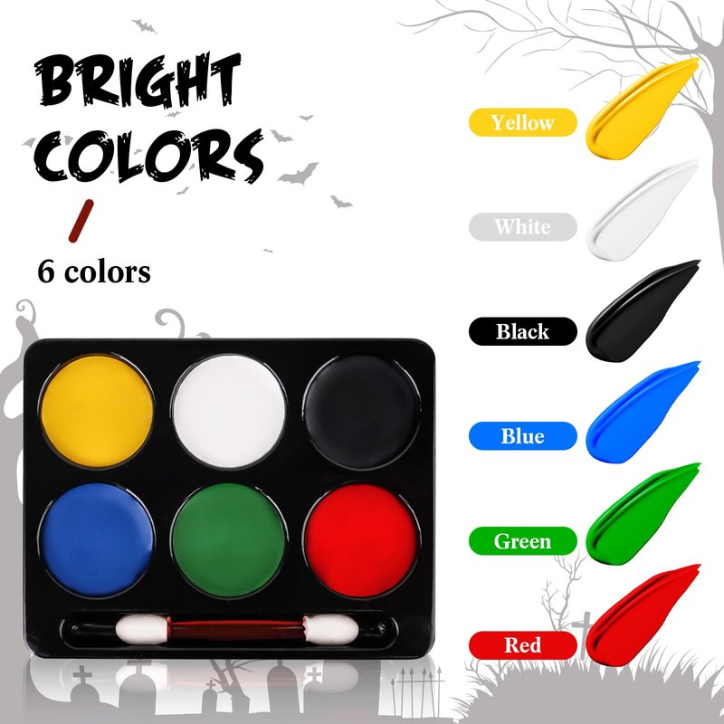 - ✔ 6 Colors Face Body Paint + Washable Fake Blood + White Cream Makeup: High-quality Paint that deliver rich color and a matte finish on your skin. Whether it's a stage performance, a themed party or a makeup look, it's easy to create stunning visuals.