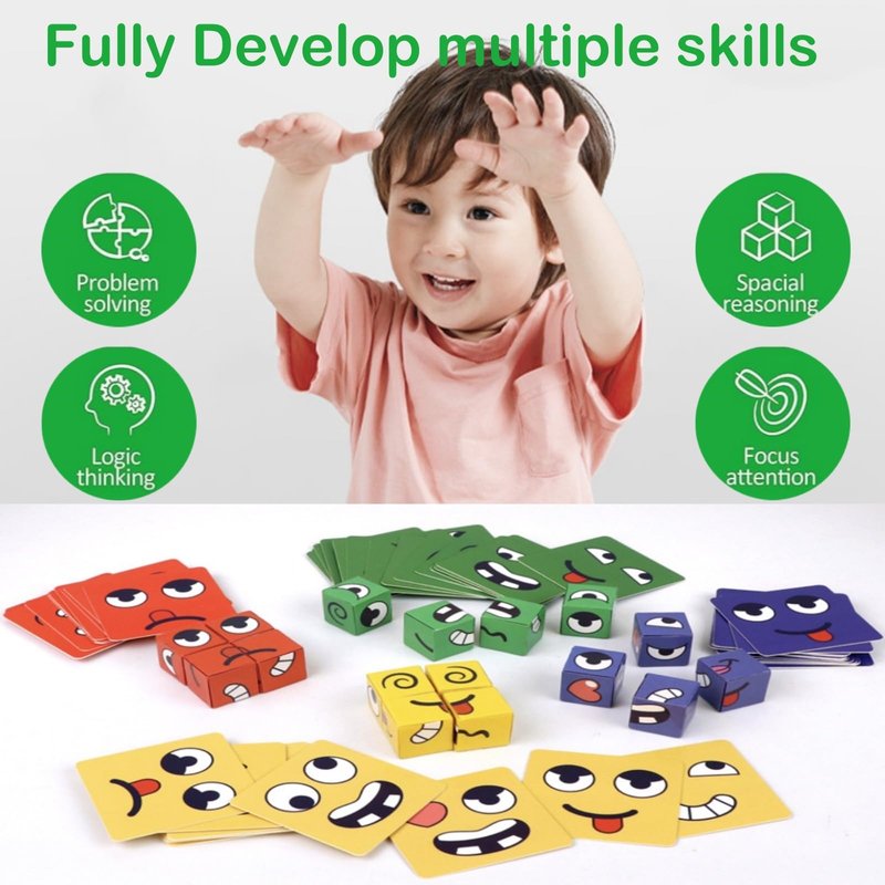 - 【EXPRESSION PUZZLE BUILDING BLOCKS】— Engage in a puzzle game that merges the strategy of puzzle building cubes with exhilarating face-to-face gameplay. How quickly can you align your colored cubes to match the card pattern ? The first player to succeed seizes the card, triggering a new race to match. Kids can play with their family members as well as their school classmates. This game promotes children's interpersonal skills and deepens friendships between children.