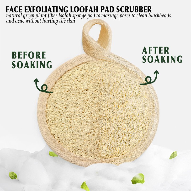 - [SIZE DESCRIPTION] Packed in a kraft environmentally friendly carton, a box of 4 pieces, 3.15in diameter round loofah pads with flexible contour fits your face contour, light and flexible is a travel necessity and the best gift for friends and relatives.