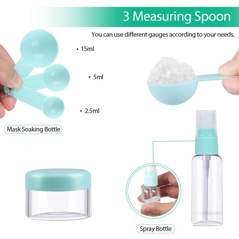 - Face Mask Kit Include: 1 facial mask mixing bowl, 1 silicon face mask brush, 1 face mask spatula, 1 soft brush, 1 facial sponge, 3 measuring spoon, 1 spray bottle and 1 small soaking bottle, 10 in 1 set. This face mask bowl and brush set is an essential tool for skin care, you can easily make a perfect and safe mask at home.