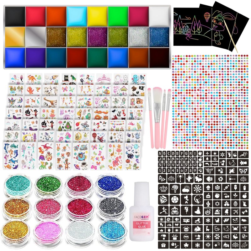 - Comprehensive Kit: This face painting kit includes 24 vibrant colours palette (6 glitter paints), 12 Colour face glitter, 139 design stencils, 555+ design temporary tattoos, 1,008 pcs rhinestones, glitter glue, 4 brushes, and 8 scratch art cards.