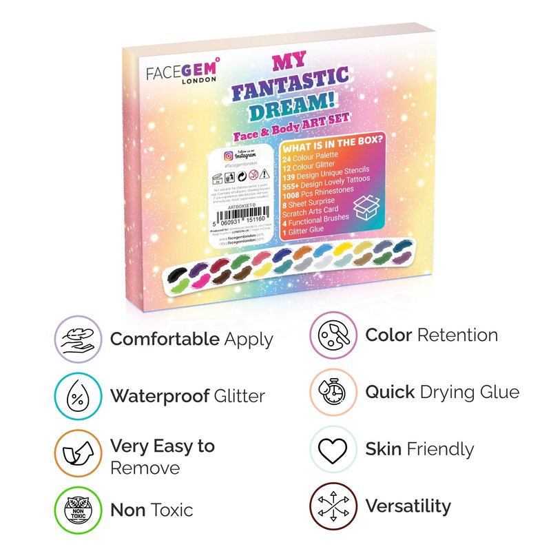 Unleash your child's creativity and let their imagination run wild with this comprehensive face painting kit! Perfect for birthdays, festivals, or any occasion, this set has everything you need to create vibrant and mesmerising designs. The 24-colour face painting palette includes 6 dazzling glitter paints, allowing you to add a touch of sparkle to your masterpieces. Complement your artwork with the 12 colourful face glitters and 1008 rhinestones for a truly eye-catching look. With 139 unique stencils and 555+ (60 sheets) of lovely temporary tattoos, the possibilities are endless. The kit also includes a body glitter glue, 4 functional brushes, and 8 surprise scratch art cards for added fun. Whether you're prepping for a festival or simply indulging in creative play, this face paint kit has everything you need to unleash your inner artist. Suitable for children, it's the perfect gift to foster their creativity and provide hours of entertainment.