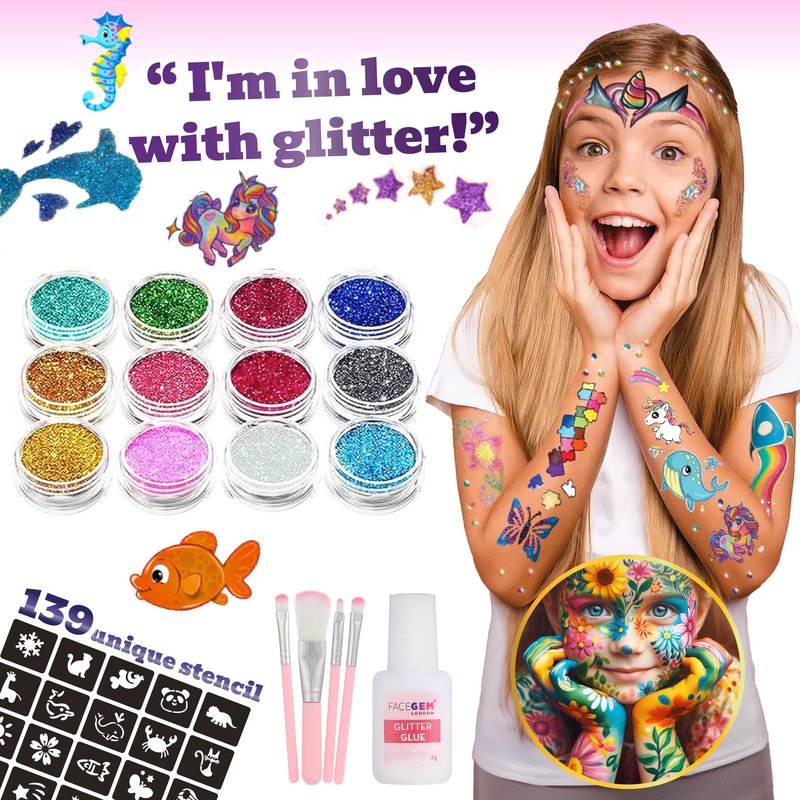 Face Paint Kit, Face Paint, Glitter Tattoos for Kids, Face Gems, Temporary Tattoos, Face Glitter, Girls Birthday Present, Face Paint for Children, Festival Accessories