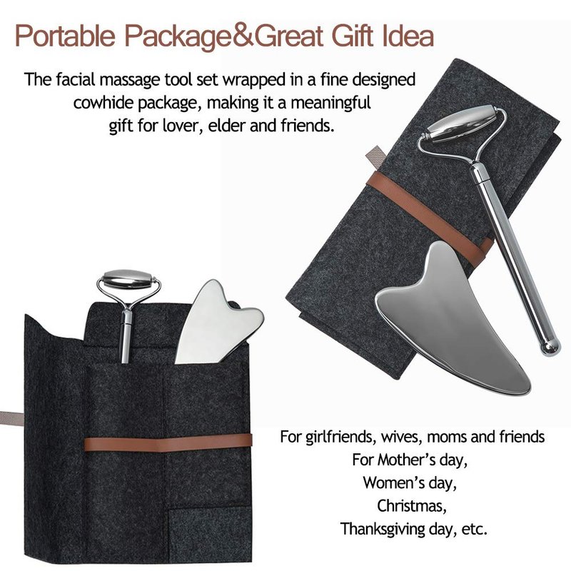 - π Sturdy&safe stainless steel material: Made of premium top quality stainless steel material, the facial massage tools set is perfect for doing facial SPA. The material itself says for durability and easy cleanup. The smooth edges and curves of the roller and scraper ensure gently touching your skin without hurting while massaging your face accurately