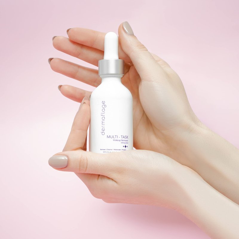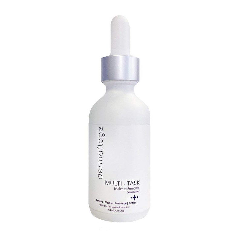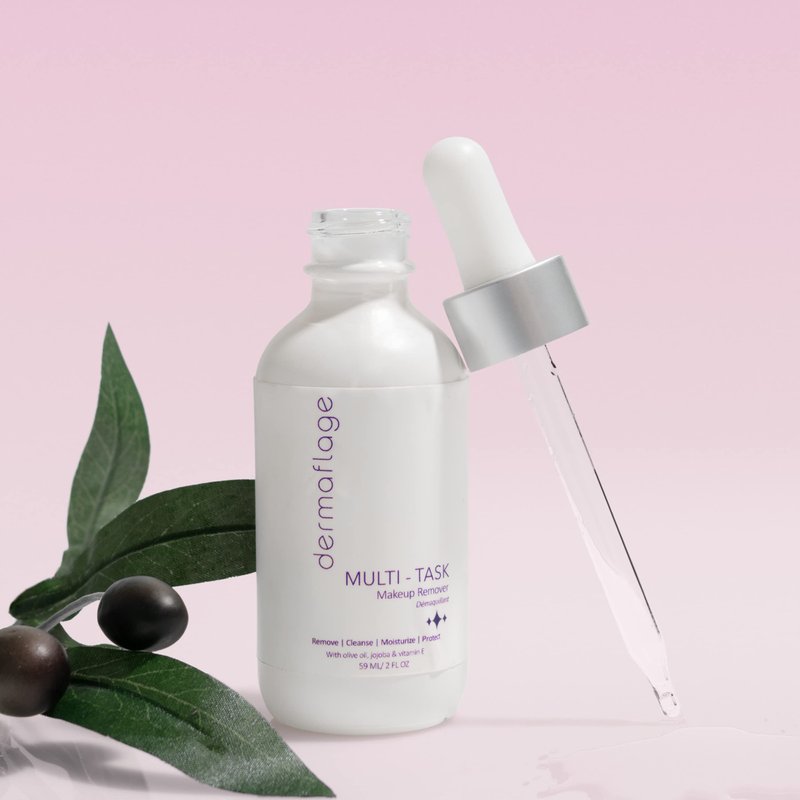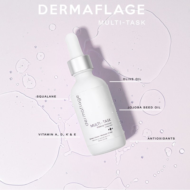 Facial Cleansing Oil Makeup Remover is a 1-step cleansing oil for sensitive skin, makeup remover, anti-aging serum & moisturizer. Formulated with olive oil, jojoba & vitamin E. Cleanse, hydrate, fight breakouts & shield your skin with powerful anti-oxidants. Multi-tasker by Dermaflage. What is it? A makeup remover that pulls double duty as a cleanser, moisturizer, anti-aging serum & environmental defense against free radicals. What is it used for? A great way to remove the toughest indelible makeup & Dermaflage Topical filler while simultaneously cleansing, moisturizing & protecting the skin. Why is it different? A makeup remover that is good for your skin! Everyone benefits because its suitable for ALL skin types, from dry to sensitive to oily & acne-prone. Multi-Task does wonders for problematic skin: Helps to diminish allergies, eczema, psoriasis, and post-operative scar tissues Treats & prevents returning acne as it removes excess oil on the face while killing off the bacteria that causes the acne Diminishes the production of excess oil