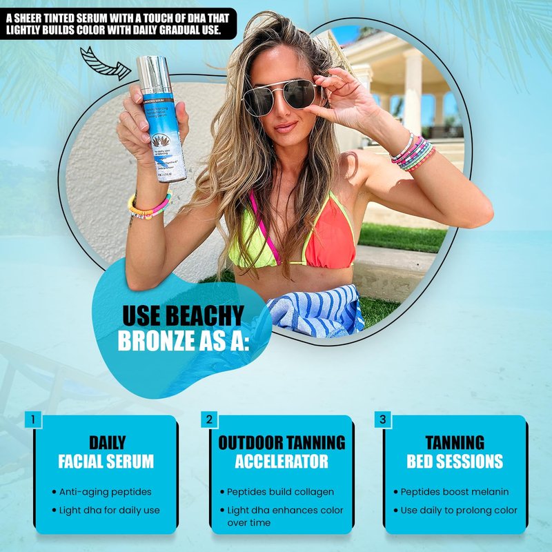 - WHO NEEDS THE SUN? - Get a beachy bronze without the burn! - Achieve sun-kissed radiance with our sheer gradual DHA bronzer. Beachy Bronze produces stunning results.