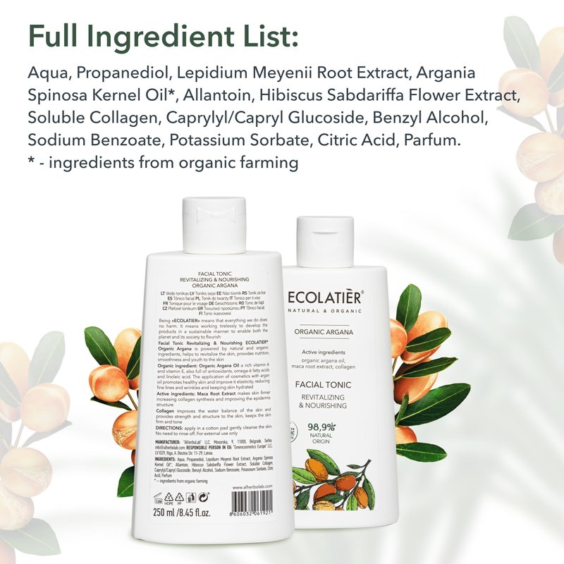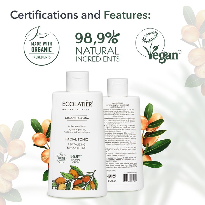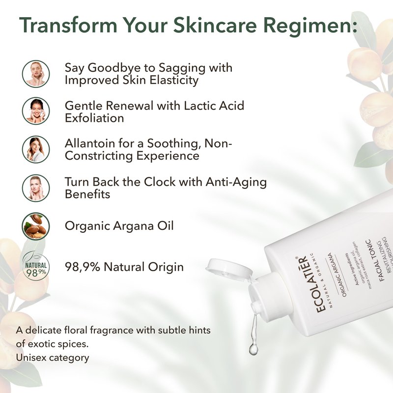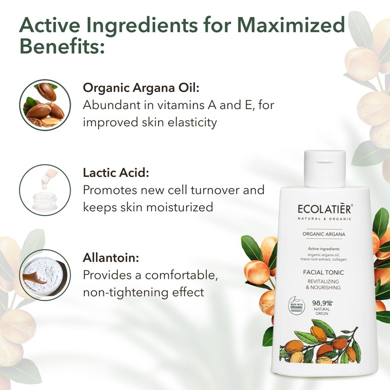 - Revitalizing facial toner with Organic Argana Oil, rich in vitamins A&E, antioxidants, omega-6, and linoleic acid, promoting skin elasticity, reducing fine lines, and deeply nourishing the skin.