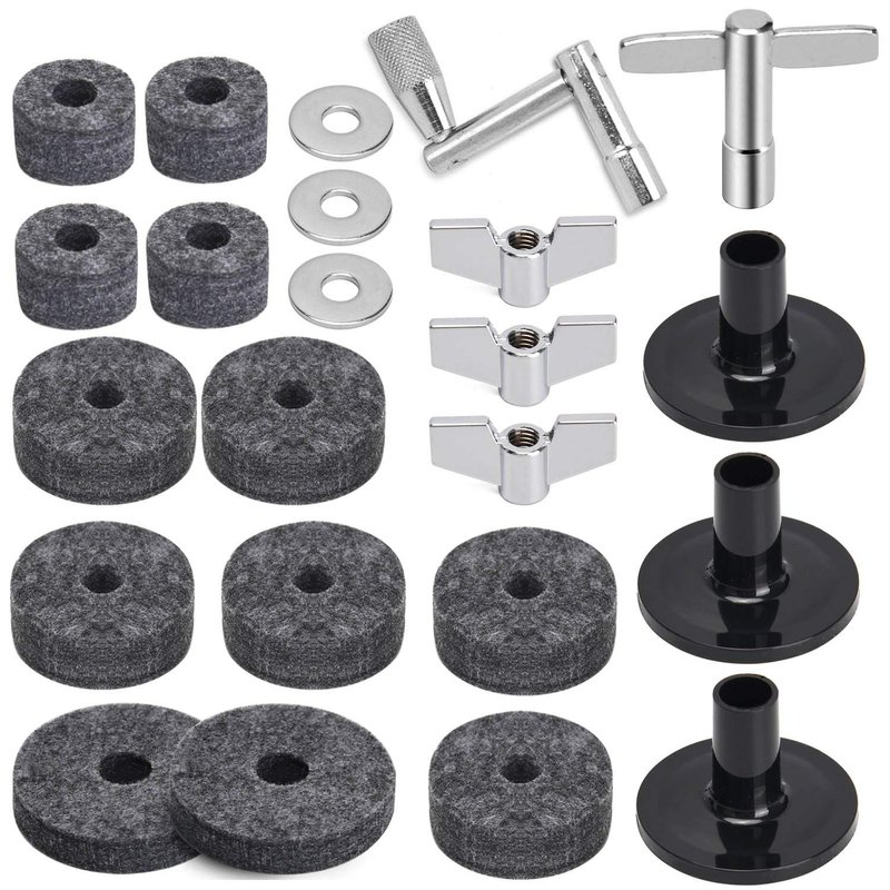 - 【PACKAGE INCLUDED】-- Include 2pcs bracket tube felts outer diameter: 2"/50mm, 6pcs cymbal felts outer diameter: 1.6"/40mm, 4pcs clutch felts outer diameter: 1"/25mm, (please note that all felts are will the same inner diameter: 0.4"/10mm), 3pcs wing nuts inner diameter: 0.3"/8mm, 3pcs washers inner diameter: 0.3"/8mm, 3pcs cymbal sleeves, 1 Z-shape drum key, T- shape drum key. Please refer to the picture for detailed dimensions, and ensure if it is the size you want before purchase.