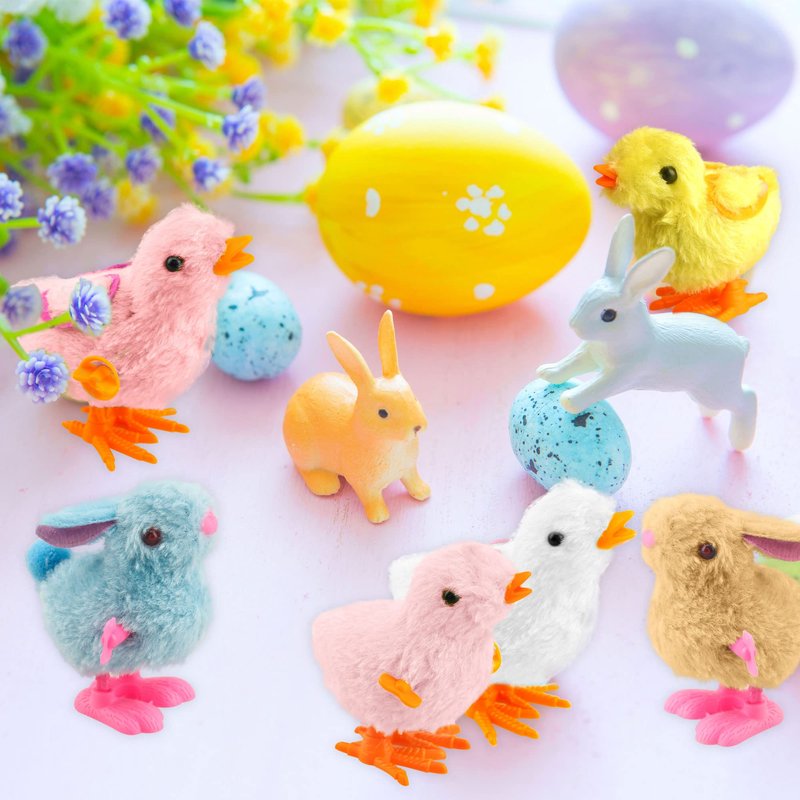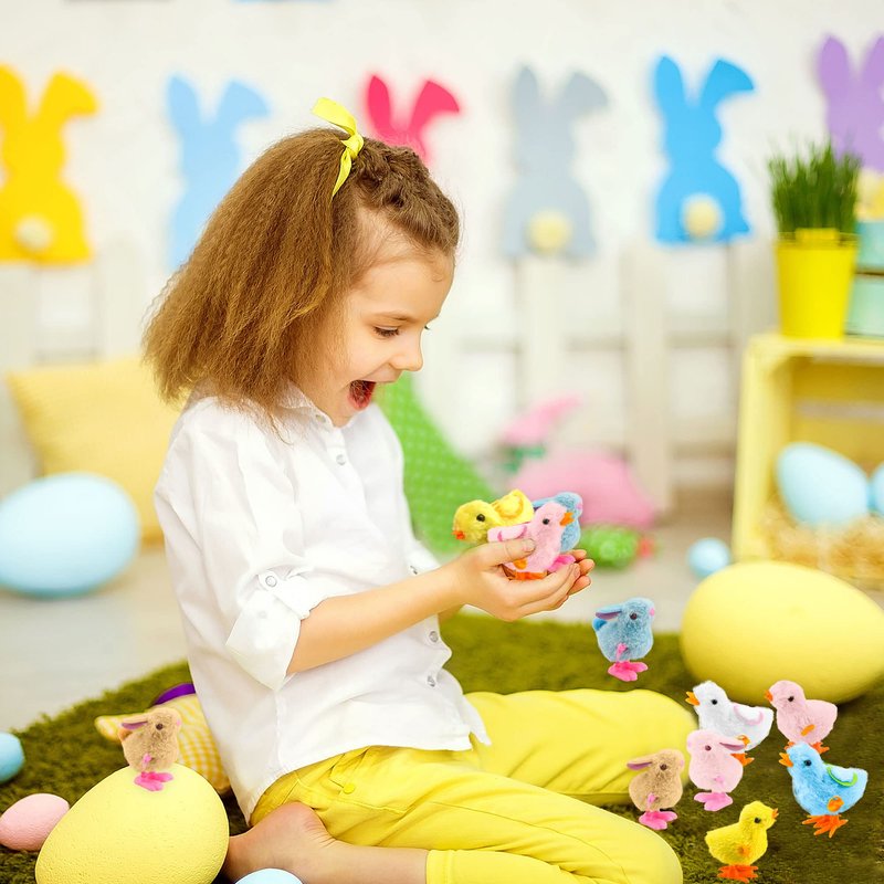 - Package include: Easter rabbits and chicks have four bright colors of pink, blue, white, and yellow. you will get 8 pieces wind-up plush wingless chicks in 4 different colors, 2 pieces for each colors, 4 pieces wind-up plush double-winged chickens, 4 pieces wind-up plush bunnies and 4 pieces cwind-up round-tailed plush bunnies all come in 4 different colors, 1 pieces for each colors, a total of 20 pieces Easter animal wind-up toys. Quantities are sufficient for your Easter or other needs