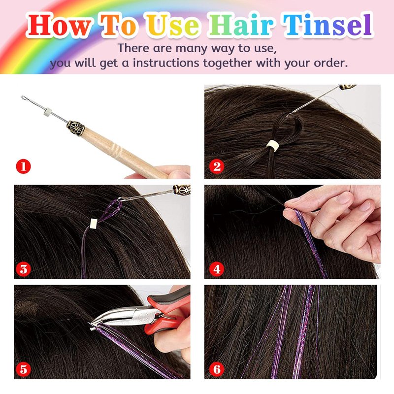 - Adjustable Tinsel Hair Extensions: Our 48" hair tinsel is long enough, and you can cut it into different lengths according to your requirements. We also give you all the tools needed for hair extensions, which are very easy to use.