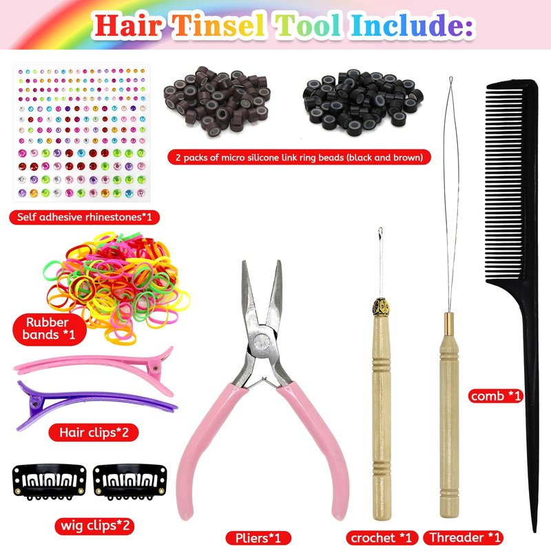 - Hair Tinsel Kit with Tools: You will get hair tinsel extensions with 12 colors 2400 strands 48 inch. hair tinsel extensions kit include: 1 crochet hook, 1 pliers, 1 comb, 2 hair clips, 1 threader, 2 wig clips, 2 packs of micro silicone link ring beads (black and brown), 1 pack of rubber bands, 1 * self adhesive rhinestones, 1 * plastic box.