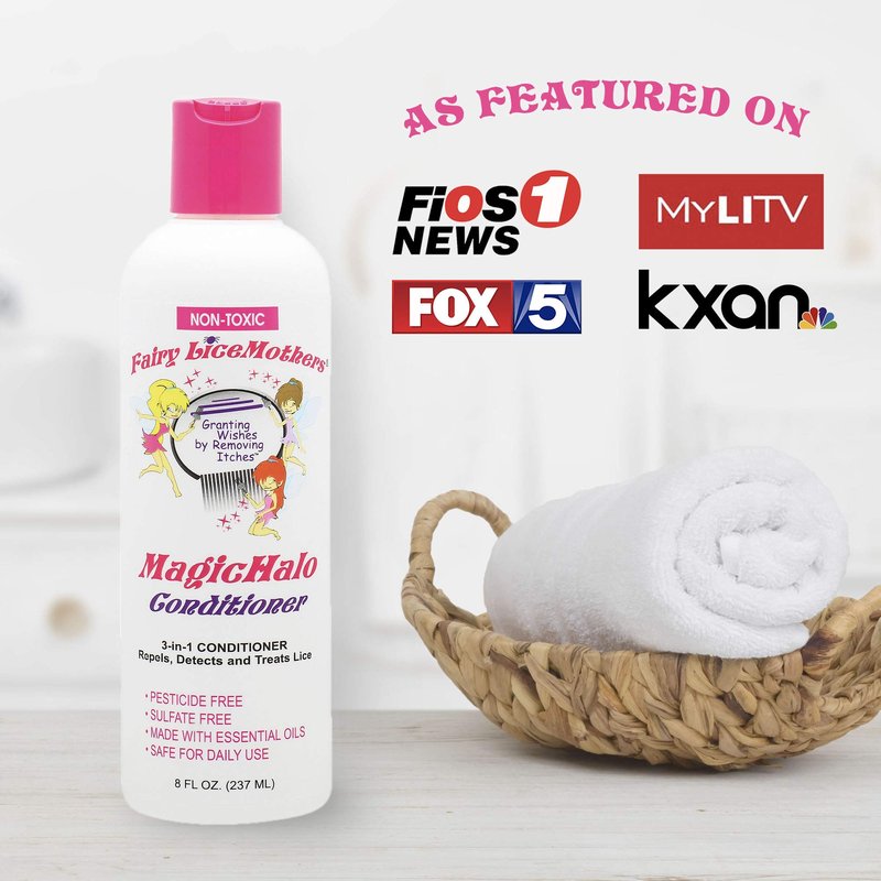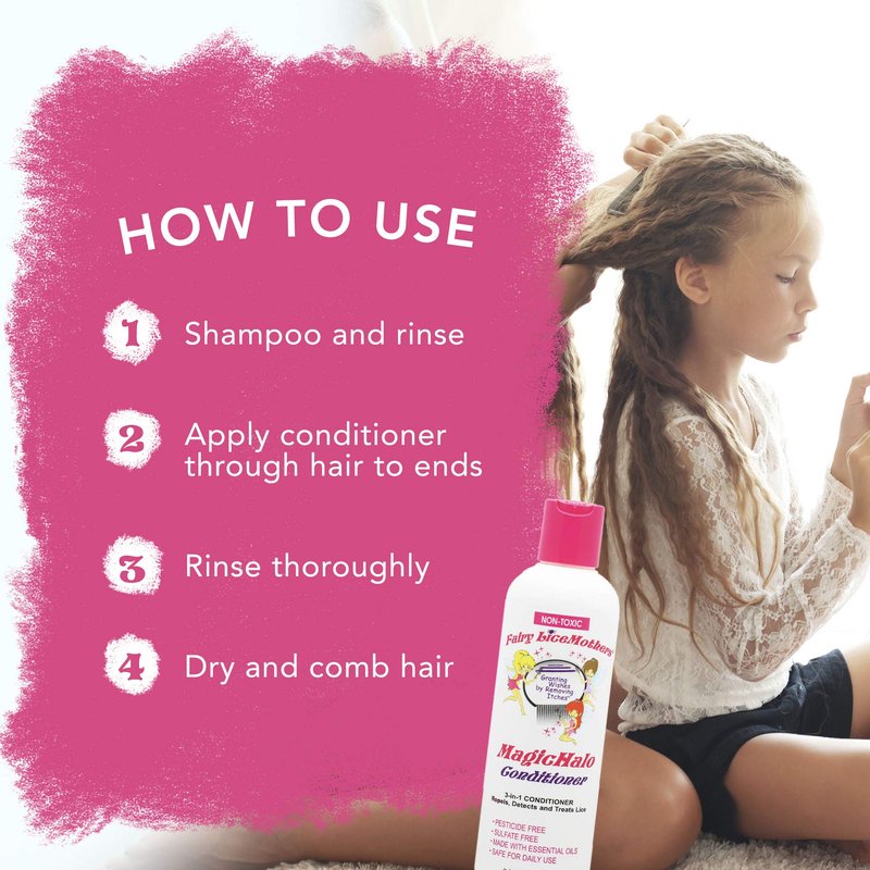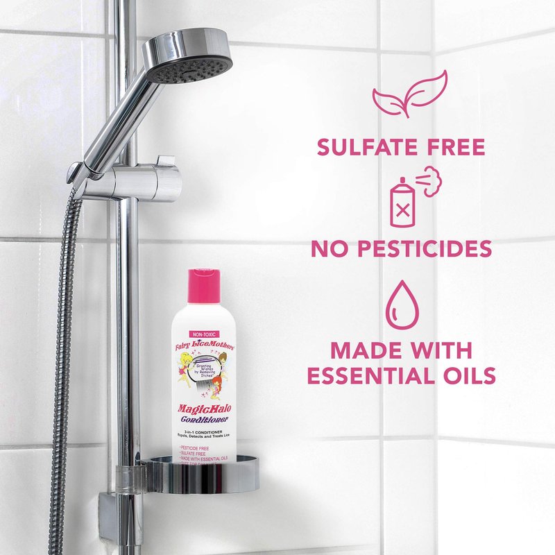 The troubles of having head lice go beyond itching. Apart from being contagious, this problem may lead to infection due to constant scratching. Take control before it is too late. Start relying on the powerful anti lice properties of MagicHalo Conditioner from Fairy LiceMothers. Our conditioner is a powerful hair care essential that works gently on your hair and scalp. It does not contain synthetic ingredients. All our products for lice treatment are based on essential oils. They are sulfate free and do not contain pesticides or any other harsh chemicals, making them safe for daily use. As a hair care essential for removing lice, we recommend these easy steps that cover 2 consecutive weeks: Week 1: Use MagicHalo Conditioner every day for 7 days. Week 2: Use it every other day for a total of 3 days in a week. Make sure you comb through your hair each time you use the conditioner with the Fairy LiceMothers MagicWand. Only thorough combing will ensure proper lice and nit removal. Also acting as daily nourishing conditioner, MagicHalo moisturizes your hair and scalp, leaving a smoother texture after each use. It has deep conditioning properties that helps detangle thick or frizzy hair. This allows the wand to glide through smoothly with every comb. Get the most desirable results by using our conditioner with MagicHalo Mousse and MagicWand. The mousse kills lice and eases the removal of nits, while the nit comb helps remove even the tiniest nits. This ensures your hair stays lice free and healthy. Don't let lice ruin your beautiful hair. Control lice infestations now by using MagicHalo Conditioner from Fairy LiceMothers.