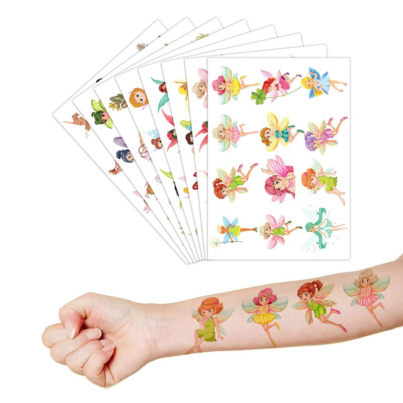 🧚♀️【PERFECT TATTOOS FOR THEMED FAIRY DECORATIONS】: Fairy temporary tattoo stickers include 8 sheets in total. There are 96Pcs super cute tattoo differences. Perfect for giving out party favors and holiday theme small gifts. The size of each sheet is 6.1 * 3.1 inches. One size fits kids 🎁【GREAT GIFT IDEAS FOR FAIRY BIRTHDAY PARTY SUPPLIES FAVORS】: The Fairy birthday party is quite imperative in funny parties achieved for girls and boys have extreme preference to the princess in fairy tale. Fairy tattoos are related to butterfly, natural scene and countryside beauty looking forward to developing the innocent and miraculous party that people included children have in common 🥳【ADD A TOUCH OF FUN】: Are you tired of mundane gifts? We've got you covered! Our collection of adorable and vibrant temporary tattoo designs can be applied to laptops, backpacks, desks, suitcases, books, water cups, and more. These playful elements will surely elevate your visual experience and bring a touch of joy to everyday items. 🌍【SAFE AND HIGH QUALITY】: Our temporary tattoos are made of environmentally friendly materials, and non-toxic, These tattoos are made of high-quality safety and green paper 🌴【EASY TO USE AND REMOVE】: Cut each tattoo out of sheets and remove the sheet clearly. You can stick it on hands, face, arms or wherever you feel safe. Moreover, you put it down on glasses, clothes, and a smooth flat . After that, you wet it thoroughly with water and wait for 20-30 seconds, you get rid of the backing paper. As a result, you have a velvety tattoo as we say 👍【PERFECT SERVICE】: If you have difficulty using our product, contact us. We will make sure to solve problems and help you have a wonderful buying experience
