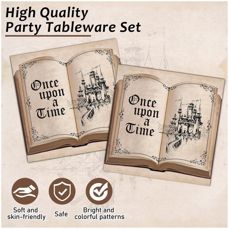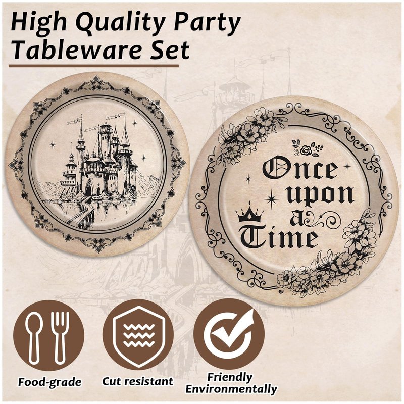 - Once Upon a Time Plates: You will receive a complete party table set, including 24 x 9 inch paper plates, 24 x 7 inch paper plates, 24 napkins and 24 black forks, beautifully printed to decorate your party scene and cater to large demand event.
