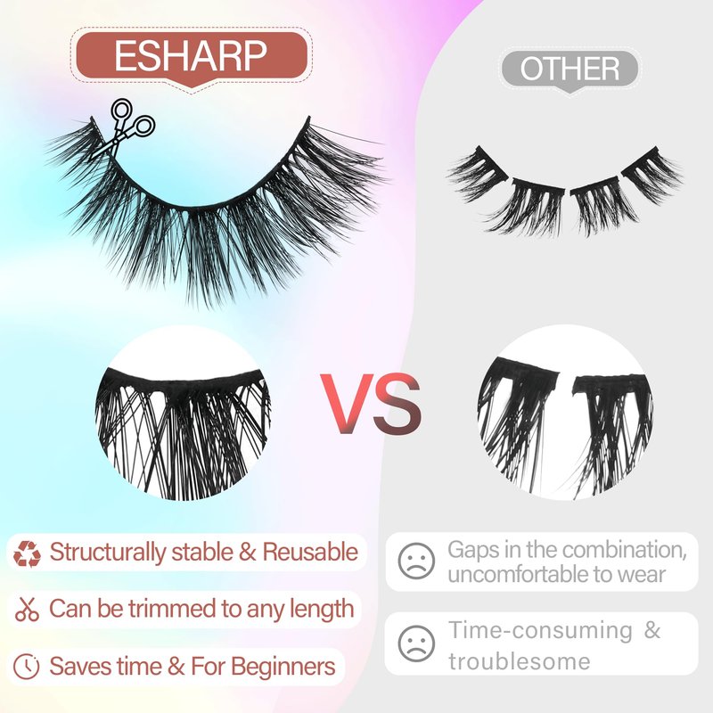 "Choose ESHARP lashes for the ultimate solution to achieving naturally full and captivating eyes. These high quality synthetic lashes are designed to be easy and comfortable to wear for beginners and experienced users alike. Precisely and meticulously crafted, these handmade lashes are lightweight and soft, ensuring comfortable wear throughout the day.ESHARP lashes are carefully designed with a 3D effect to provide a natural and full look, adding depth and dimension to your eyes and enhancing your personal appeal. Whether you're attending a special occasion or a casual gathering, ESHARP lashes are perfect for the wearer of your choice, making it easy to show off your unique style. ESHARP lashes are not only lightweight, but also durable and long-lasting, bonding firmly without causing any discomfort. With proper care and storage, each pair of ESHARP lashes can be used up to 10 times to ensure value for money. Additionally, these synthetic lashes can be easily trimmed to the desired length, providing the flexibility and freedom to customize your look to your liking. Now, trust ESHARP, choose ESHARP and be more true to yourself!"