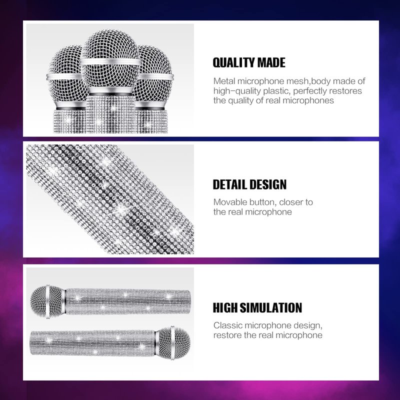 - Quality Material: the wireless microphone prop is inlaid in glittered rhinestone, dazzle with brilliance, hard to fall off, and the inner is metal with plastic body, strong and durable, it doesn't break easily, and the mesh is also not easy to deform, it is reusable and can serve you for a long time