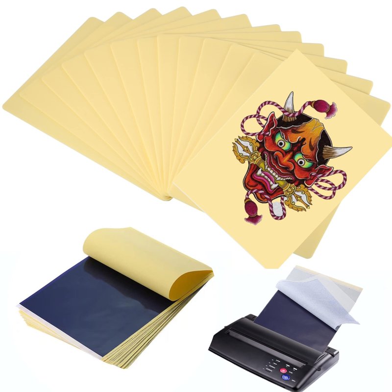 - ★4 LAYERS TRANSFER PAPER Tattoo paper has 4 layers, the first layer is white master paper; the second layer of translucent protective paper should be discarded; the third layer is blue carbon page; the fourth layer is yellow backplane. These thermal stencil paper can be easily, cleanly and smoothly transferred