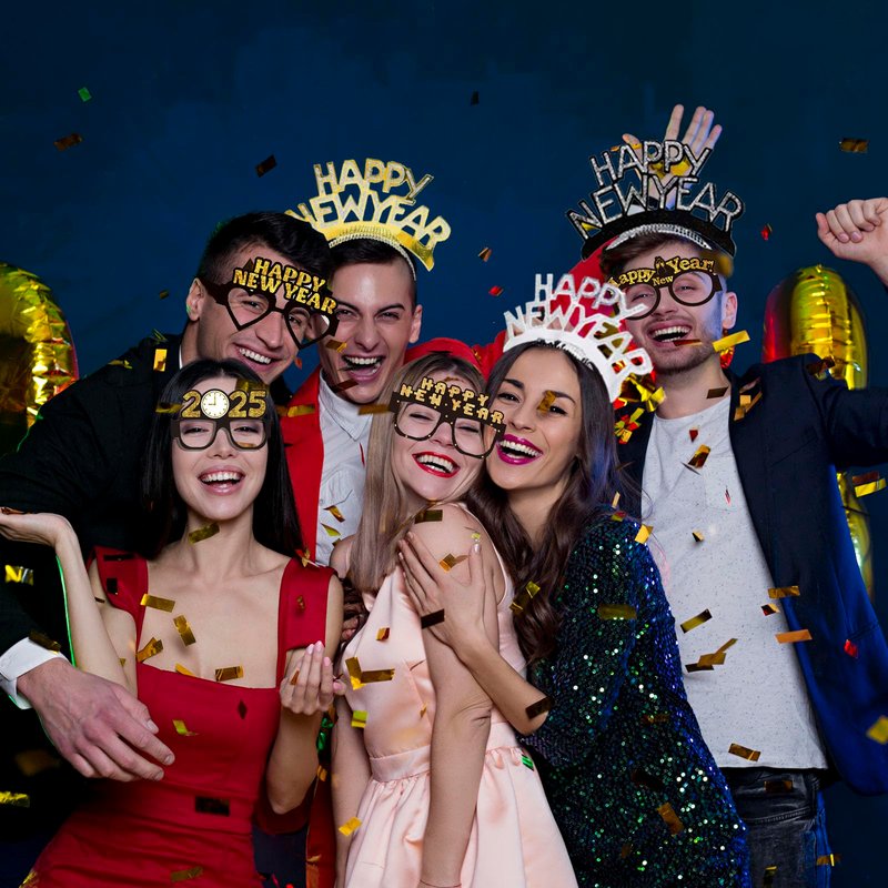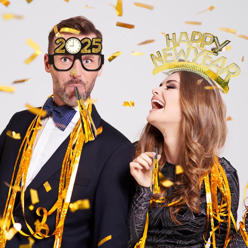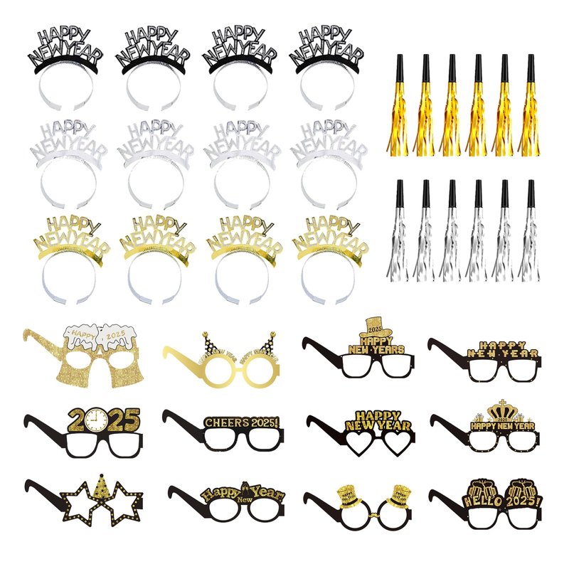 - Vibrant New Year Celebration: Elevate your 2025 New Year's Eve party with our all-inclusive decoration set. With 12 noise makers, 12 headbands in 3 colors, and 12 party glasses, you'll have everything you need for a lively celebration.