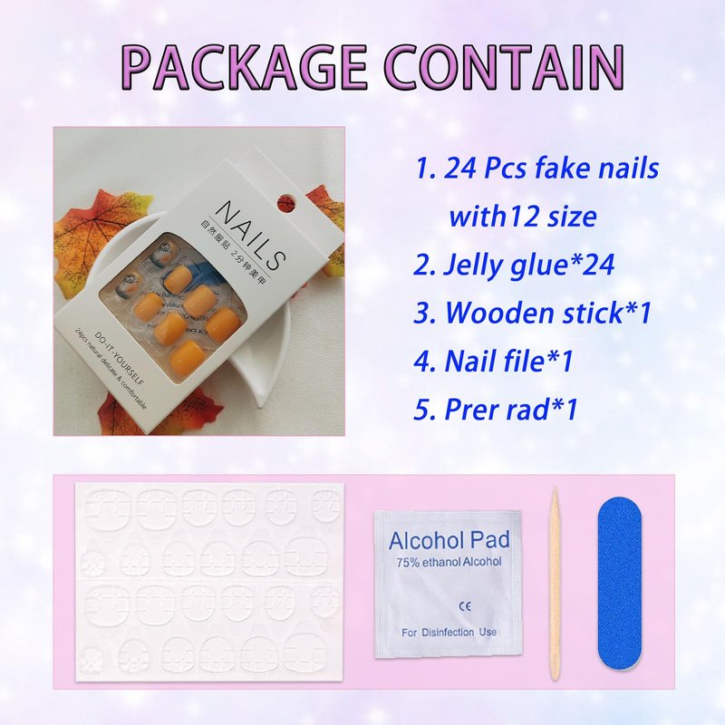 - What's Include: 12 nail sizes 24 thanksgiving fake nails ensure a totally custom fit, plus we give you everything needed just in case! Each set comes complete with a storage box, adhesive tabs, double-sided nail file, cuticle stick, and prep pad.