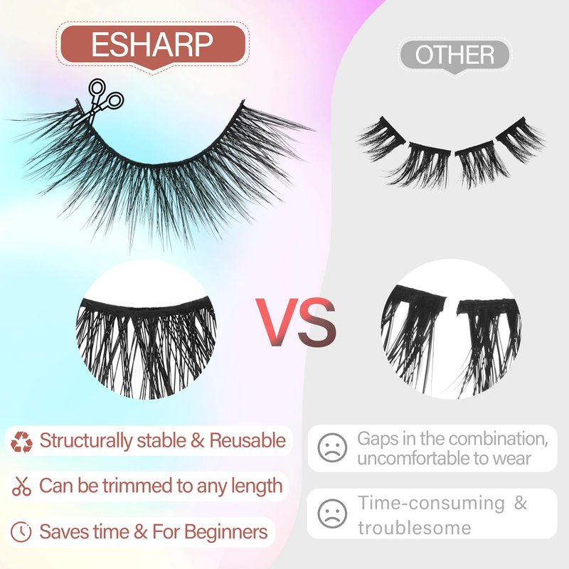 "Choose ESHARP lashes for the ultimate solution to achieving naturally full and captivating eyes. These high quality synthetic lashes are designed to be easy and comfortable to wear for beginners and experienced users alike. Precisely and meticulously crafted, these handmade lashes are lightweight and soft, ensuring comfortable wear throughout the day.ESHARP lashes are carefully designed with a 3D effect to provide a natural and full look, adding depth and dimension to your eyes and enhancing your personal appeal. Whether you're attending a special occasion or a casual gathering, ESHARP lashes are perfect for the wearer of your choice, making it easy to show off your unique style. ESHARP lashes are not only lightweight, but also durable and long-lasting, bonding firmly without causing any discomfort. With proper care and storage, each pair of ESHARP lashes can be used up to 10 times to ensure value for money. Additionally, these synthetic lashes can be easily trimmed to the desired length, providing the flexibility and freedom to customize your look to your liking. Now, trust ESHARP, choose ESHARP and be more true to yourself!"