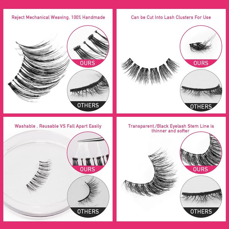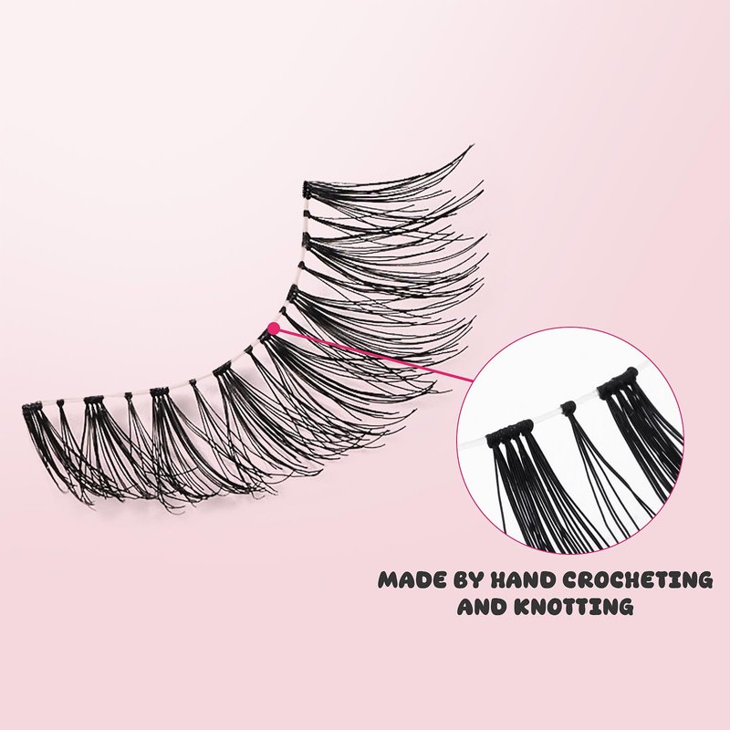 - 100% Handmade:Crafted with care, our eyelashes are meticulously hand-crocheted and knotted to perfection. The stems are glue-free, and the lashes are waterproof and boast an impressive wear of up to 15 times -the advantage of reusability! The hand-layering technique gives these lashes a seamless, natural look that blends effortlessly with your own. Plus, they're cruelty-free, so you can enjoy beauty without compromise.