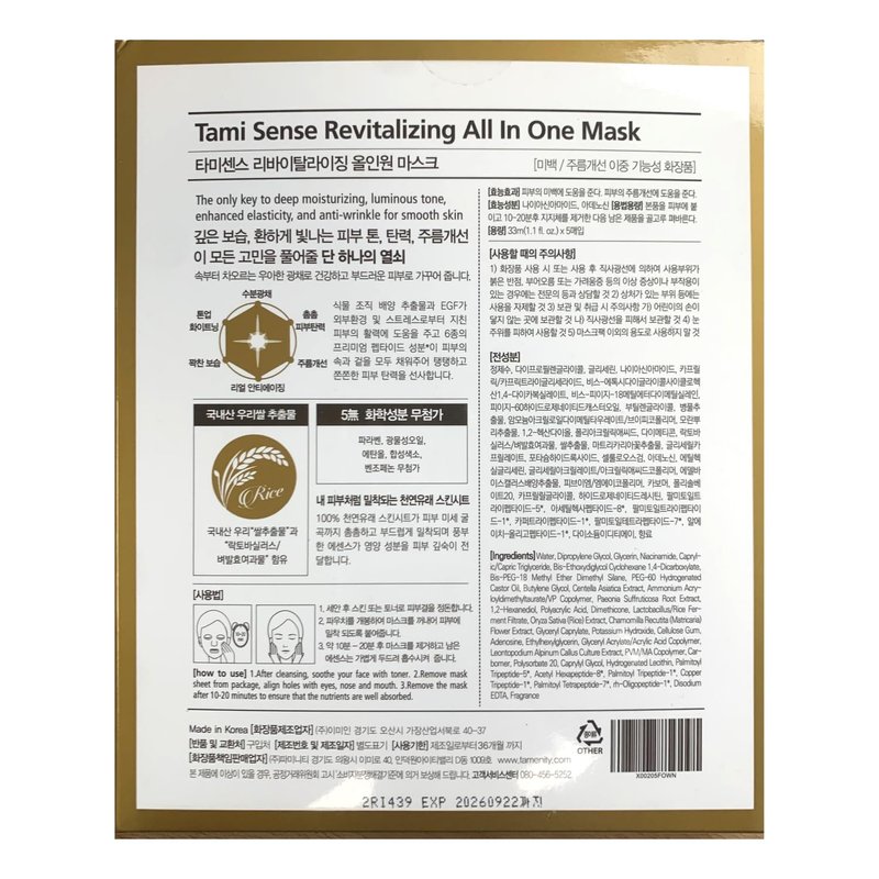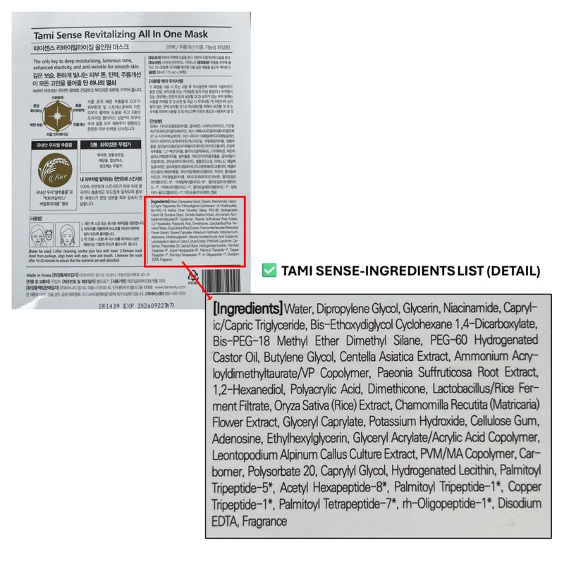 - Tami Sense Revitalizing All in One Mask 2 SET (15 EA): Better ingredients like Rice Fermented Extract Serum, Botanical Stem Cell Sheet
