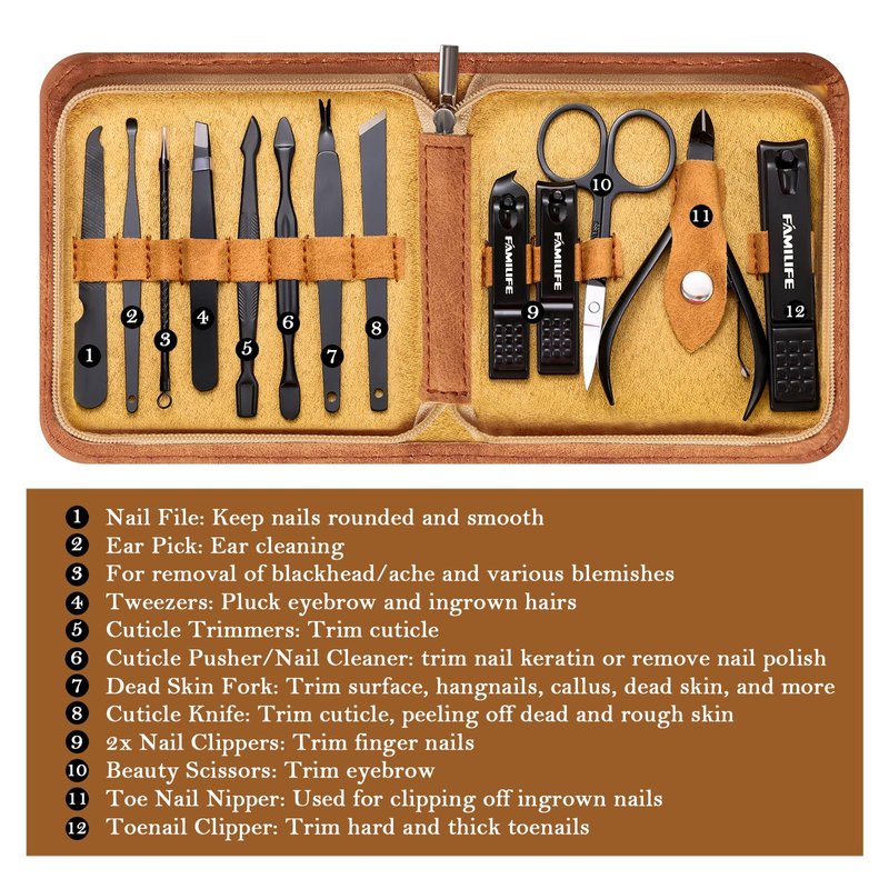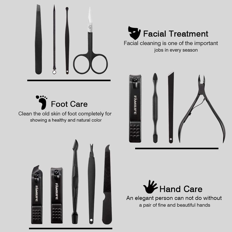 - ▶13 Pcs Stainless Steel Manicure Set - FAMILIFE Professional Manicure Kit contains 13 nail accessories for hand care, facial care and foot care kit. Our stainless steel nail set is high quality manicure set, which is strong and durable, and this nail tools will not fade, extremely hard and sharp. Designed for lifetime use. Nail trimmer kit for men is the first choice for successful men and exquisite women.
