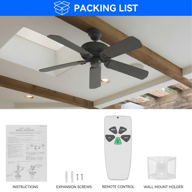 - 【 Package 】 Includes Remote Control *1, Wall Mount Holder *1, User Manual *1, Screws *2. This ceiling fan remote control use a 9V battery (NOT INCLUDE) for power supply.